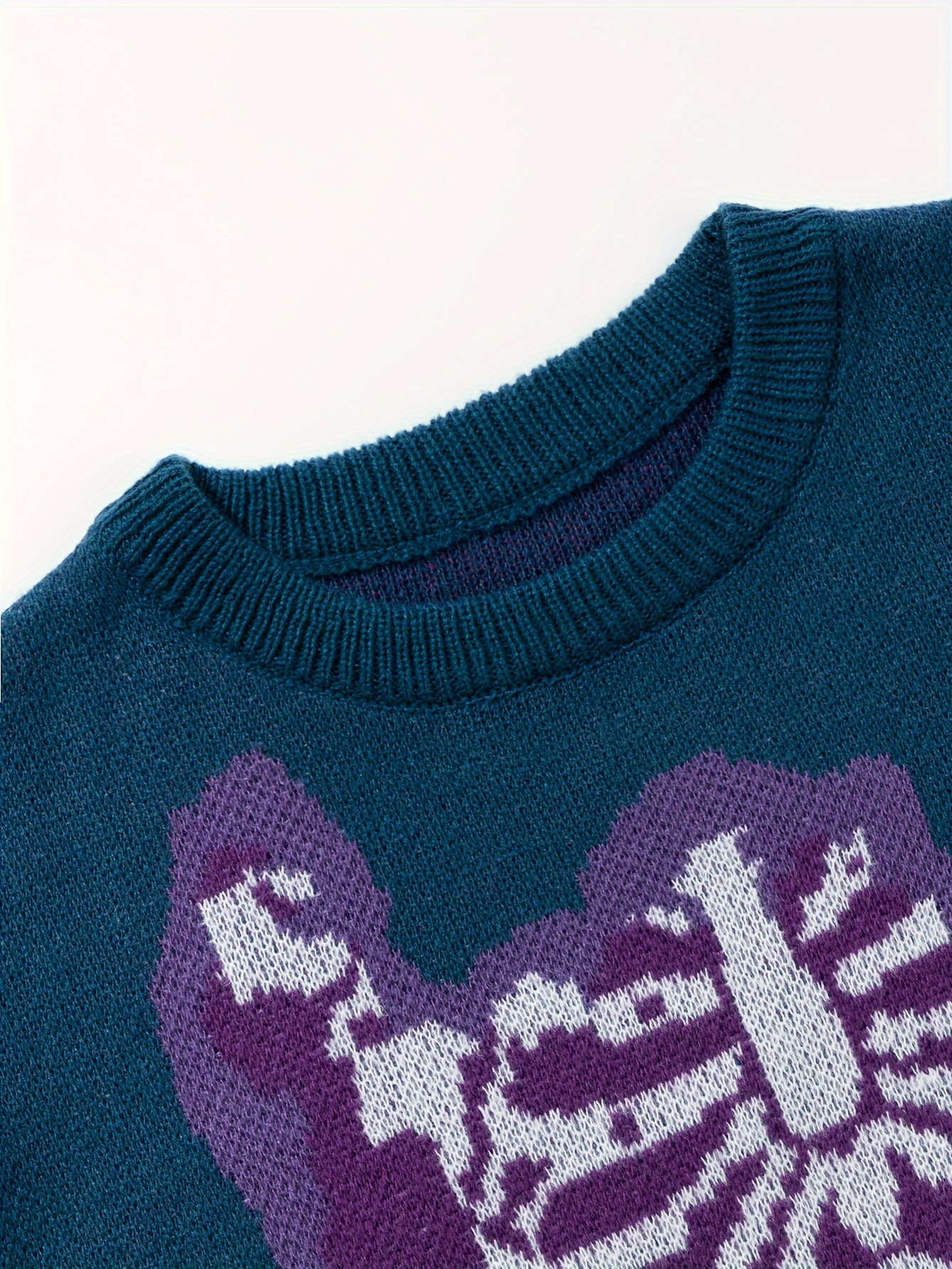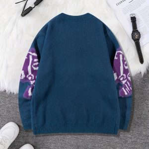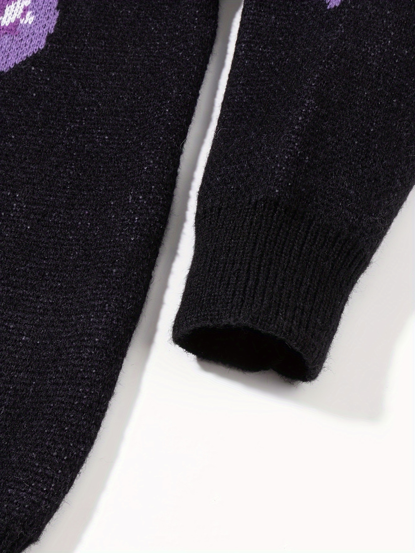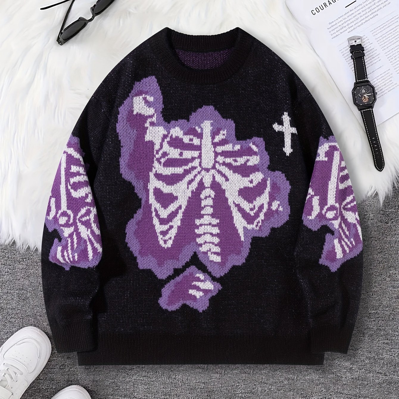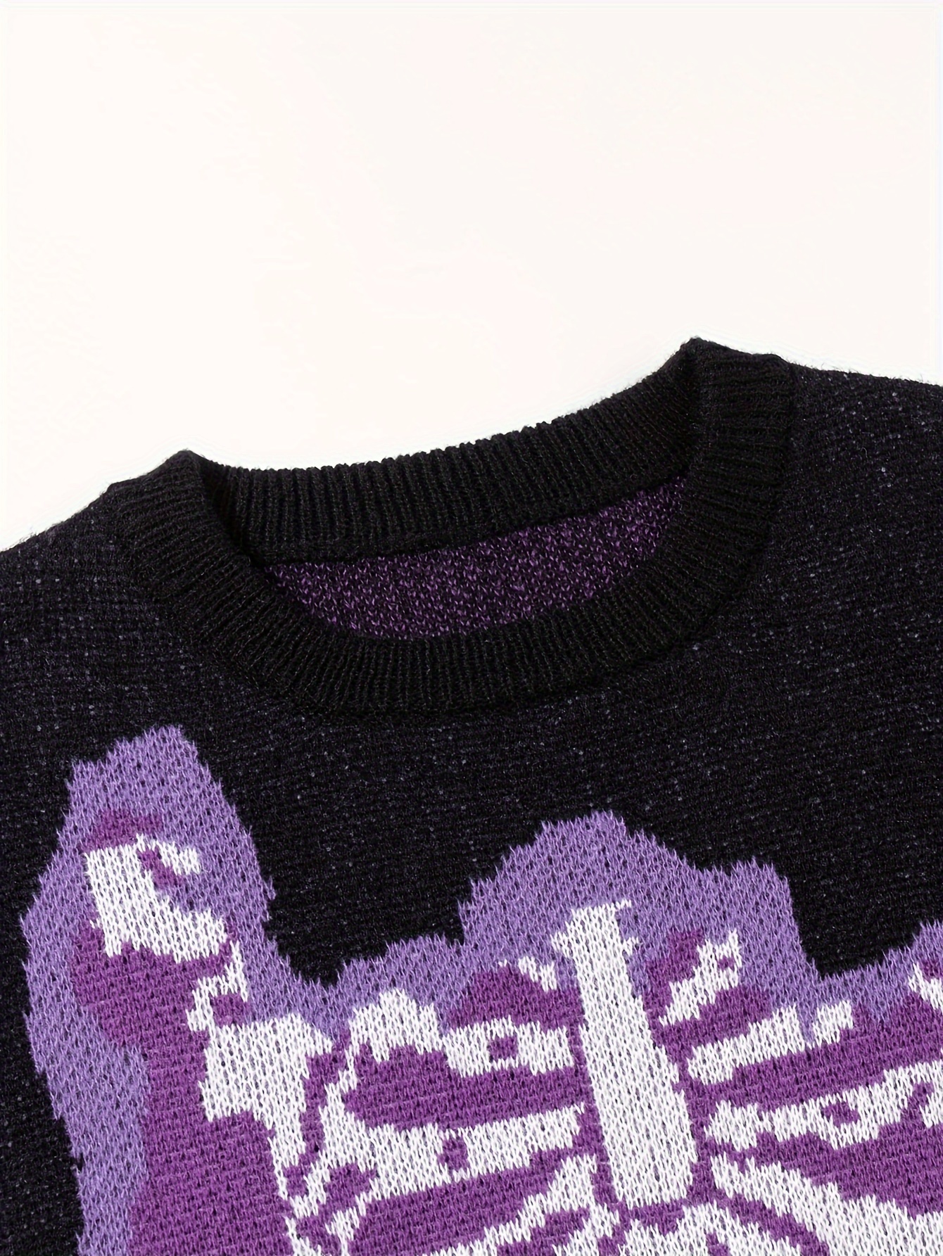 - 1pc Men’s Casual Pullover – Round Neck Sweater – Regular Fit for Autumnu002FWinter – Polyester Knit with Halloween Skeleton Pattern