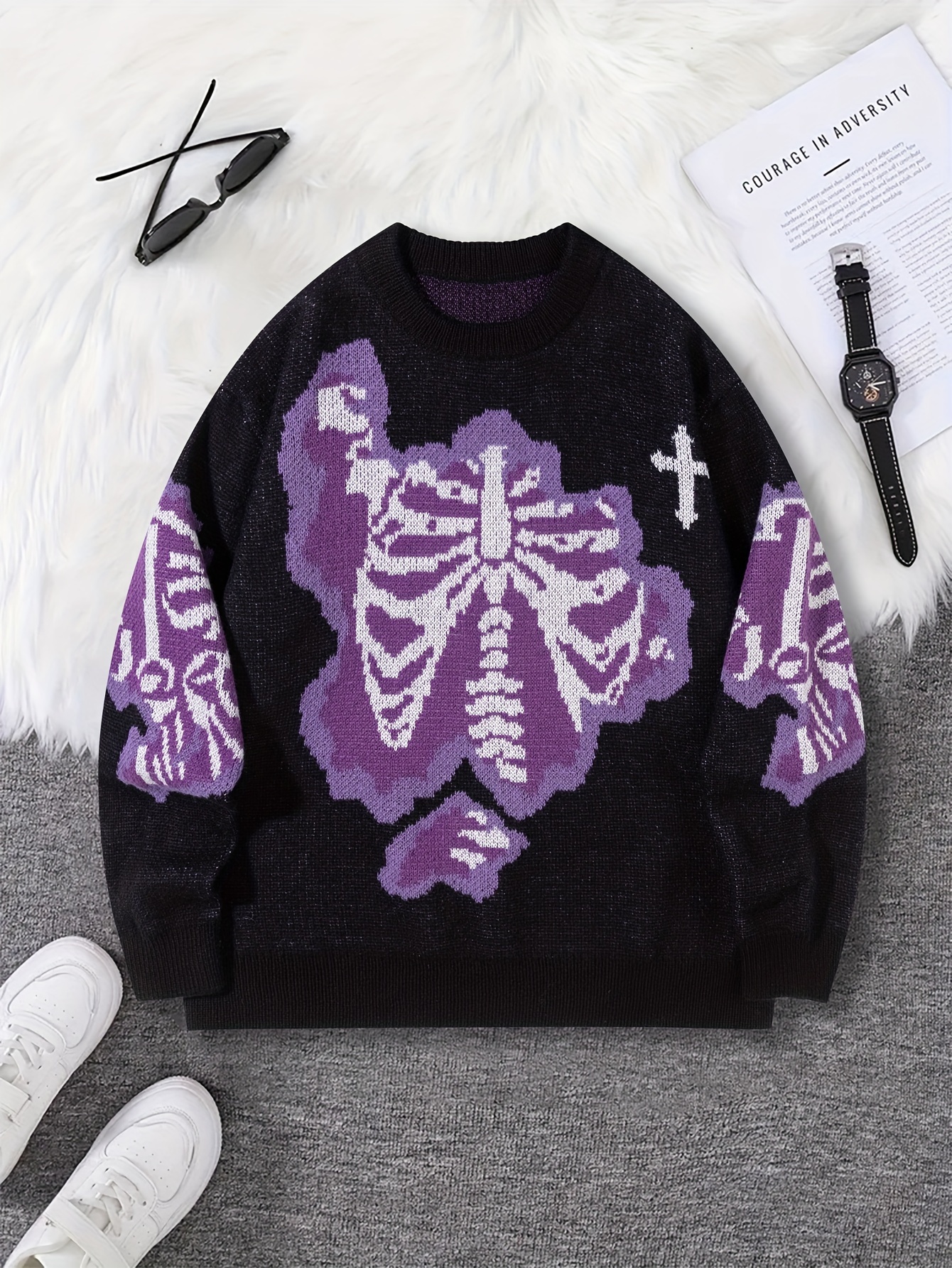 1pc Men’s Casual Pullover – Round Neck Sweater – Regular Fit for Autumnu002FWinter – Polyester Knit with Halloween Skeleton Pattern
