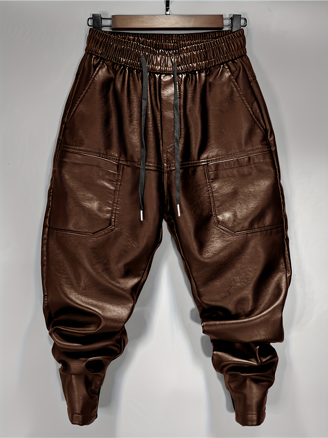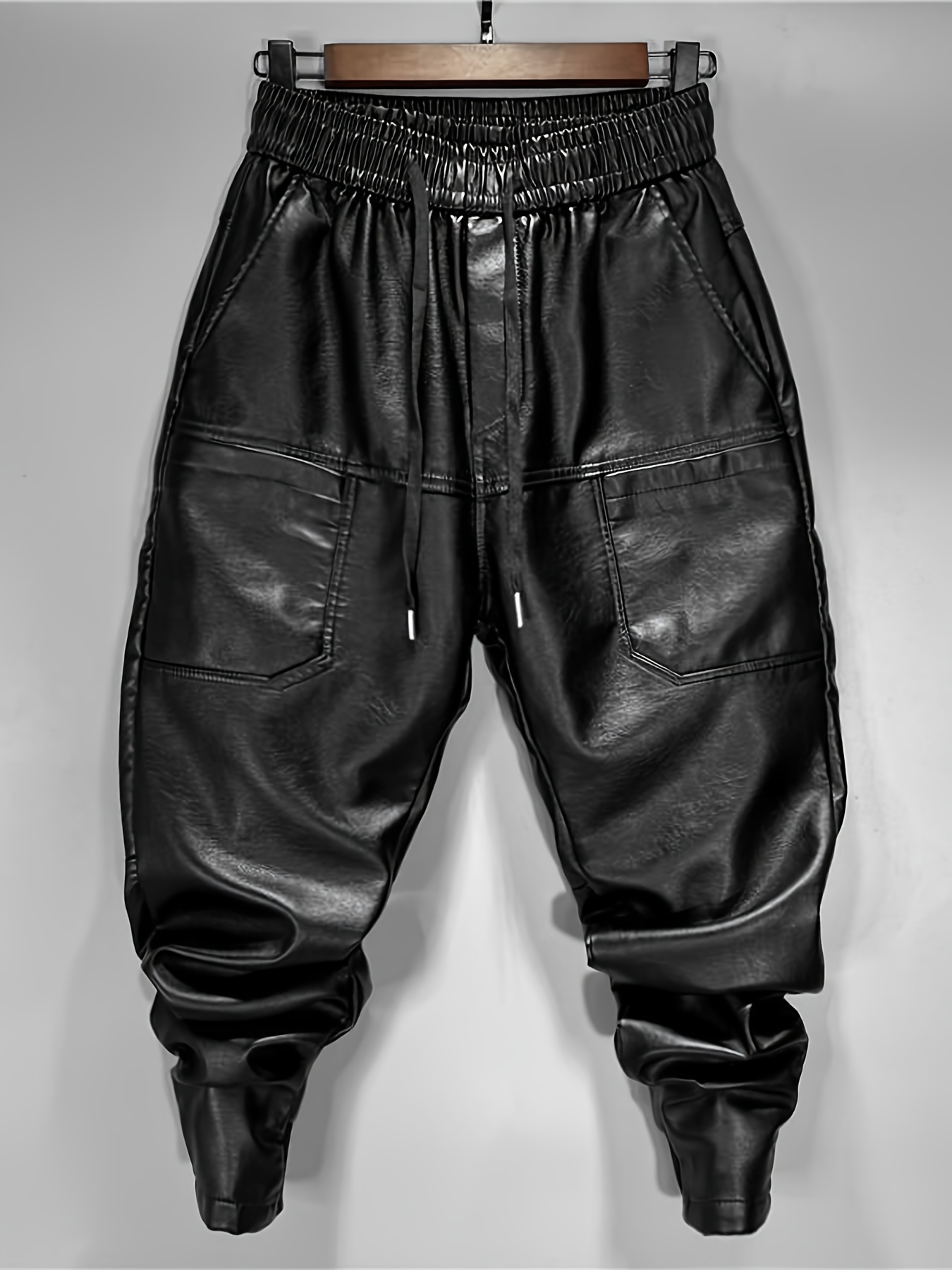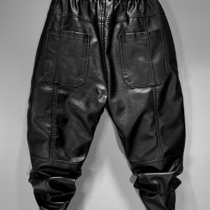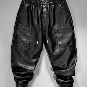 829 Men’s Fashion Casual Three-Dimensional Cut Personality Front Pocket Drawstring Elastic Waist PU Leather Pants Casual Trousers