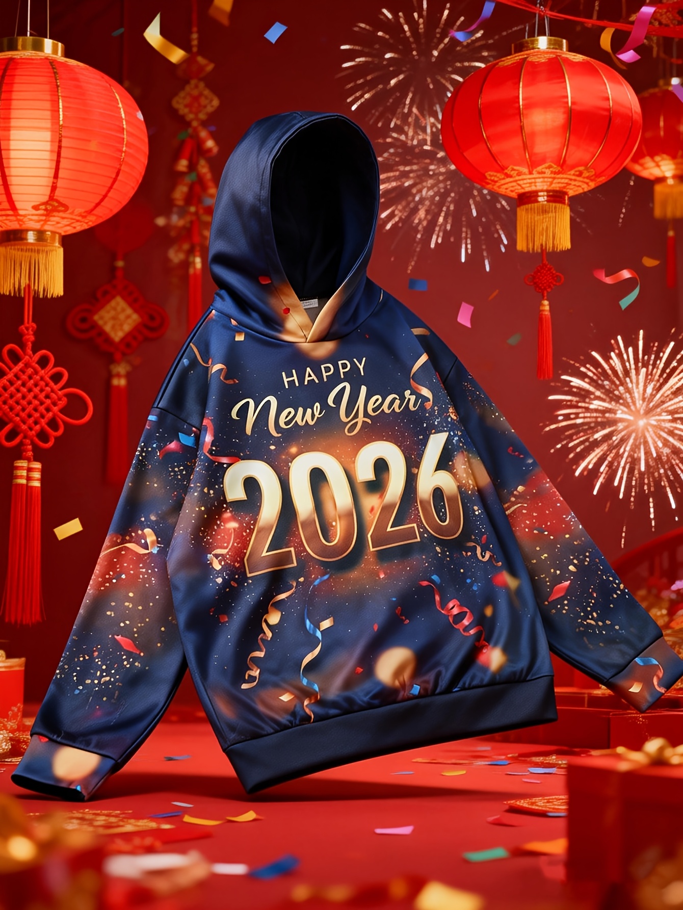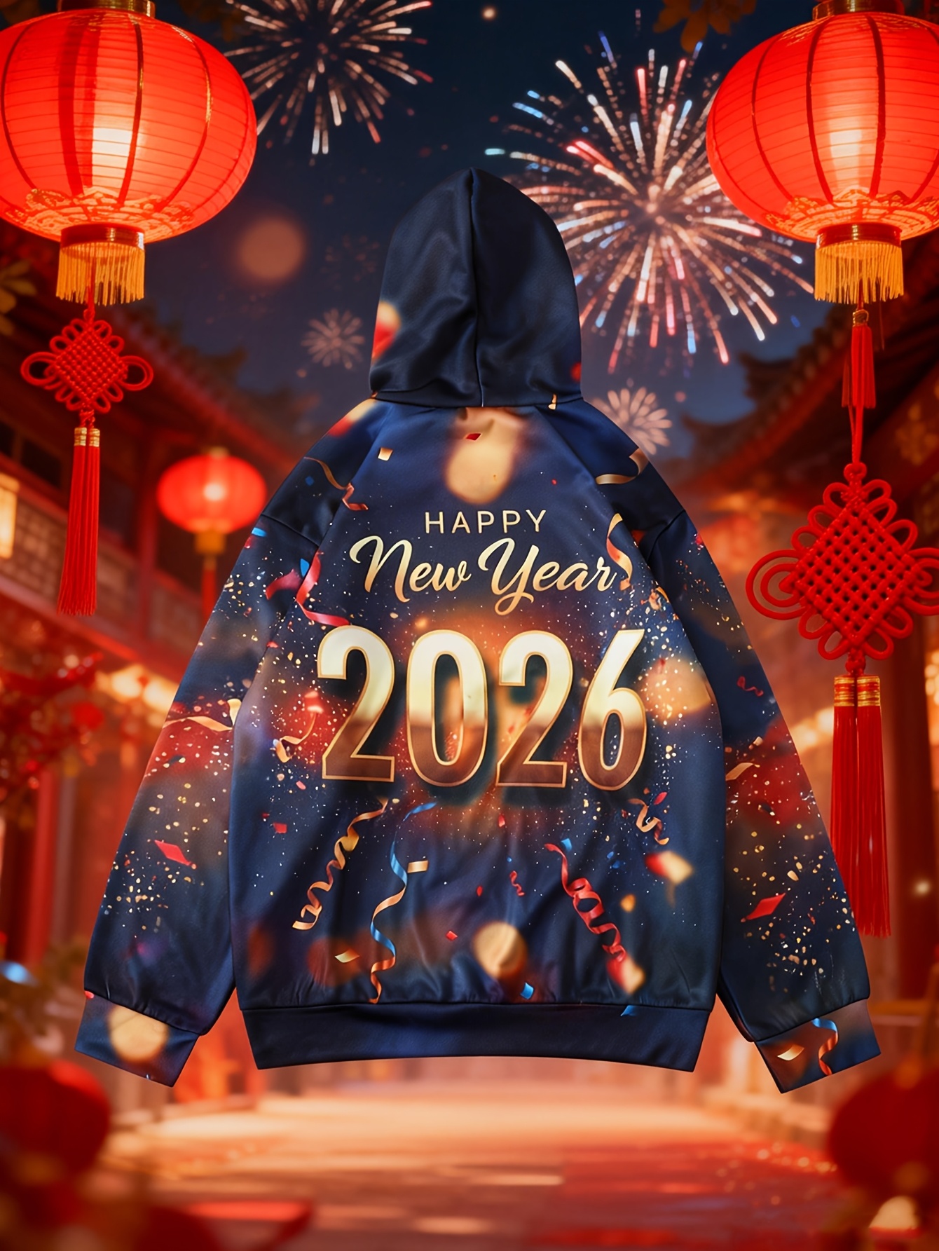 New Arrival 2026 New Year Limited Edition Hoodie – Navy Blue Base with Festive Ribbon Digital Print