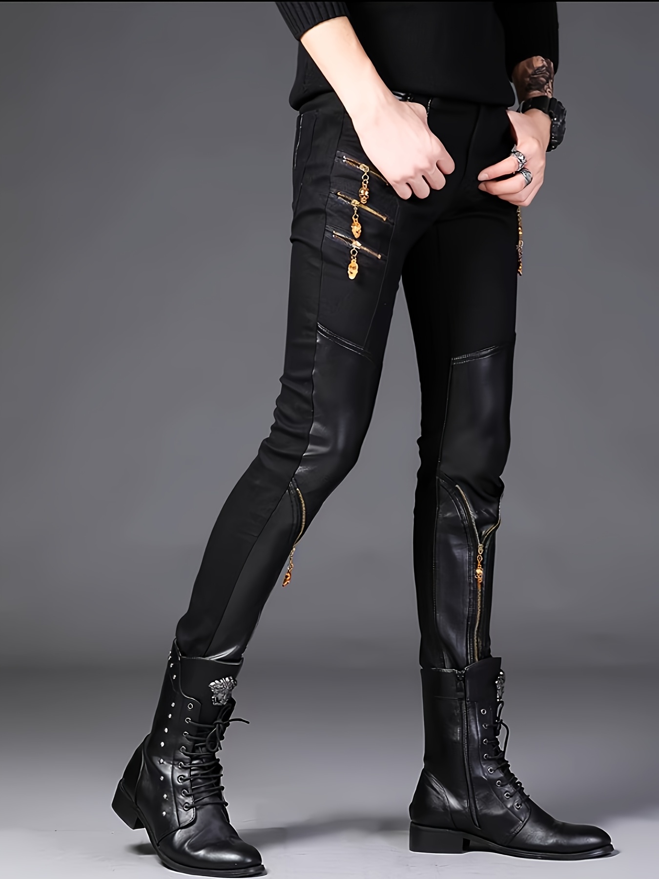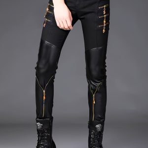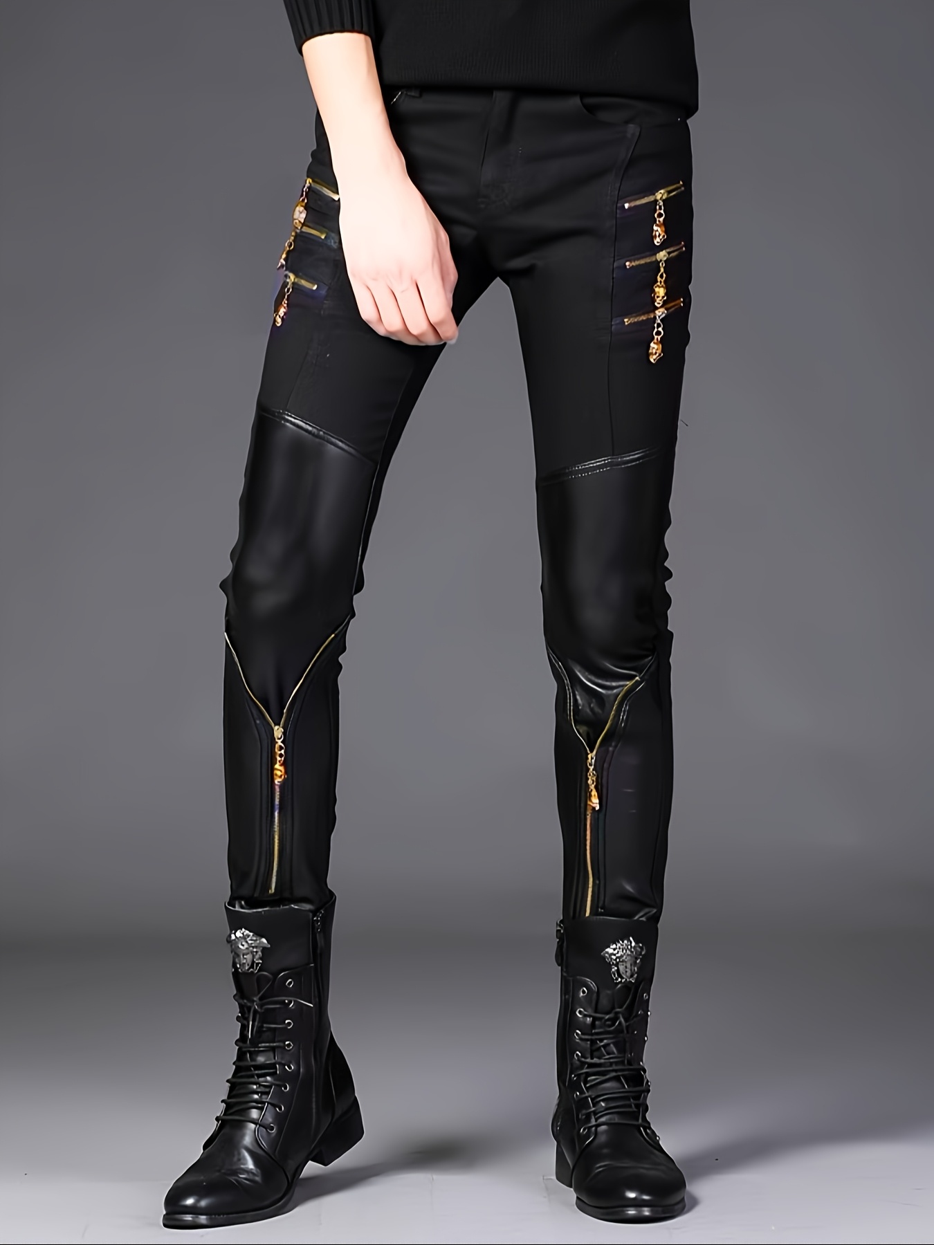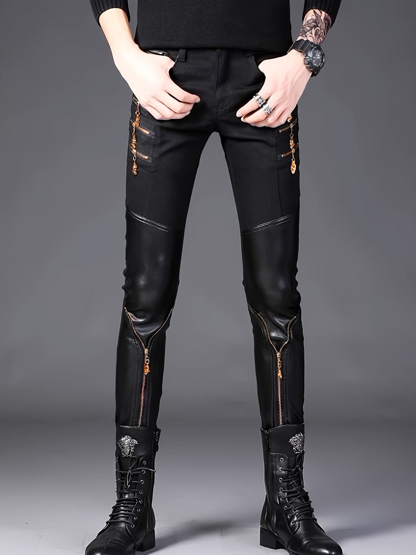 Spring Collection Men’s Korean Style Slim-Fit Pants, Trendy Men’s Knee-Patch Zippered Half- Pants with Golden 3D Skull Zipper, Mainstream Zippered Skinny Fit Half- Men’s Long Pants