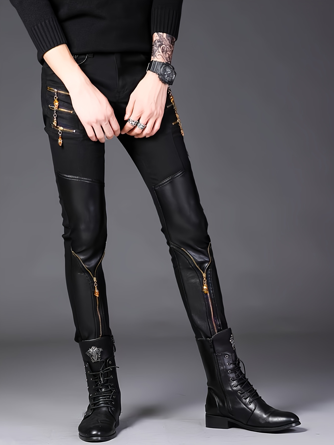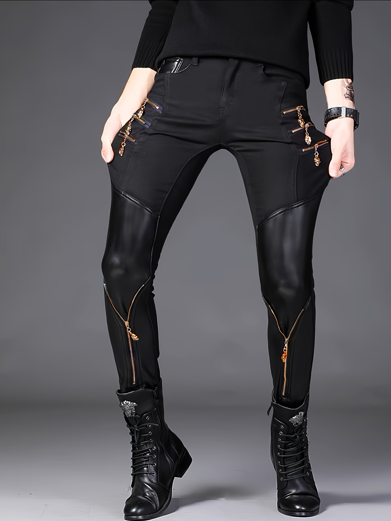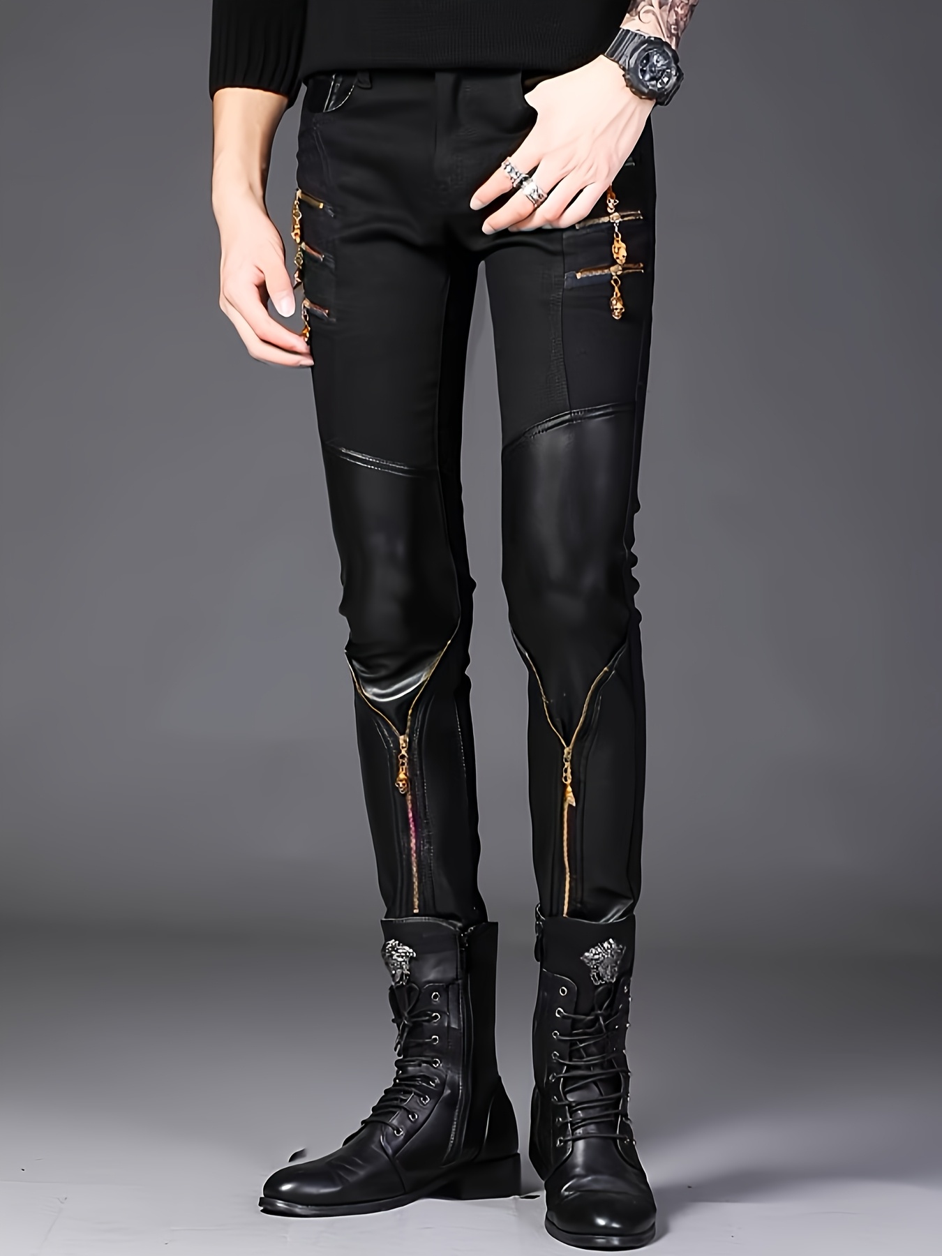 Spring Collection Men’s Korean Style Slim-Fit Pants, Trendy Men’s Knee-Patch Zippered Half- Pants with Golden 3D Skull Zipper, Mainstream Zippered Skinny Fit Half- Men’s Long Pants